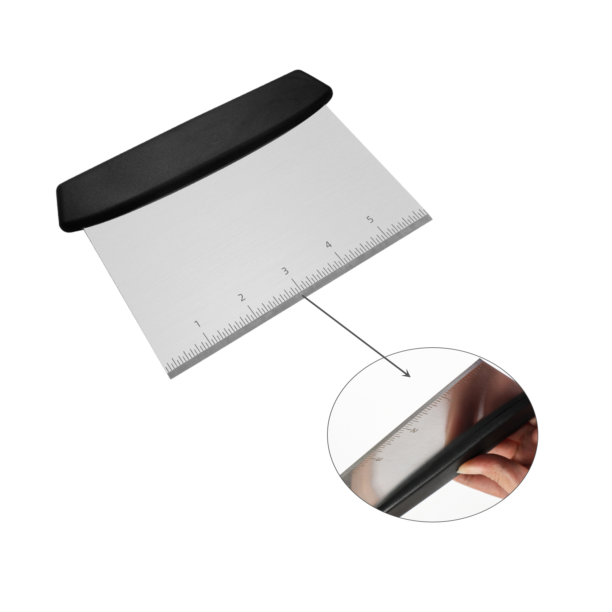 Upgrade your kitchen toolkit with the Bench Scraper With Plastic Handle! Made from PP and 410 stainless steel with handy measurement markings. The smooth surface cleans easily, while the sharp edge cuts dough cleanly without sticking. Add a personal touch with custom engraving. Your reliable helper for baking, cooking, and keeping counters tidy!. Sizing: 15.2x12cm.