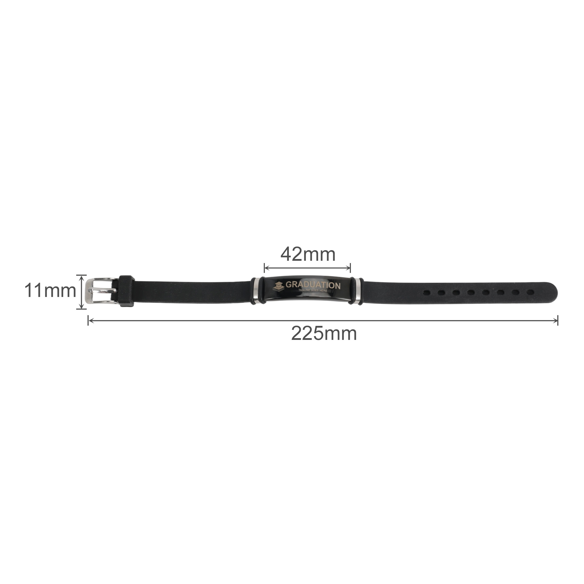Create vibrant brand awareness with our Engraved Bracelet, equipped with an adjustable needle buckle for easy and reliable fastening. Crafted from soft silicone rubber and sturdy metal, our bracelet features a black strap and a metal arc in silver, black or gold. Personalise the bracelet with your logos or brand messages through engraving to boost the impact of brand promotions. Ideal for daily wear, promotional events, or brand campaigns, our bracelet delivers both style and effective brand visibility. Sizing: Silicone bracelet: L225 x W11mm Metal: L42 x W11mm.