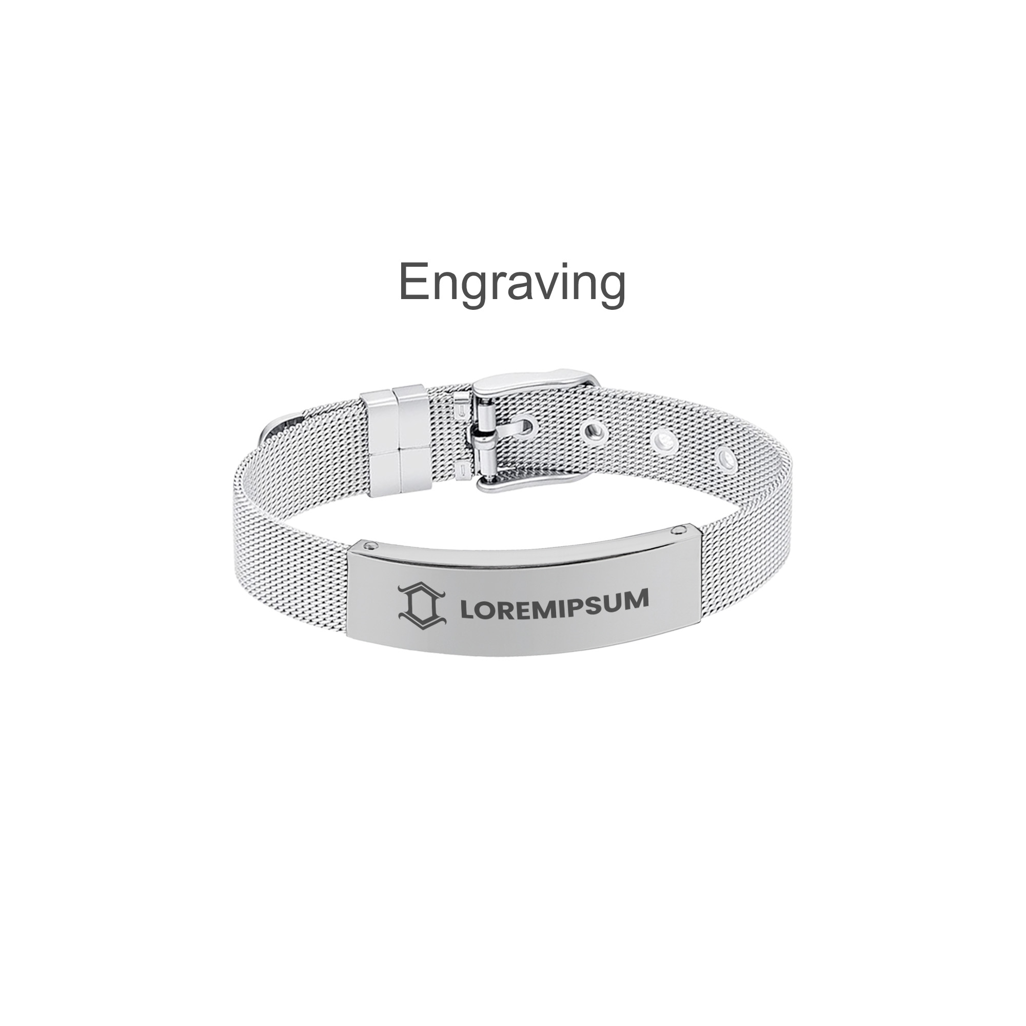 Make your brand stand out with our Metal Bracelet, crafted from premium metal. Our bracelet features an adjustable needle buckle, a sleek silver strap and a polished arc, creating a professional look. Durable construction ensures reliable everyday use. Personalise the bracelet through engraving, which showcases your brand messages or logos with clear visibility. Ideal for daily wear, promotional events, or team activities, our bracelet provides constant brand exposure. Sizing: Watch strap: L240 x W15mm Metal: L45 x W15.8 x H6mm.