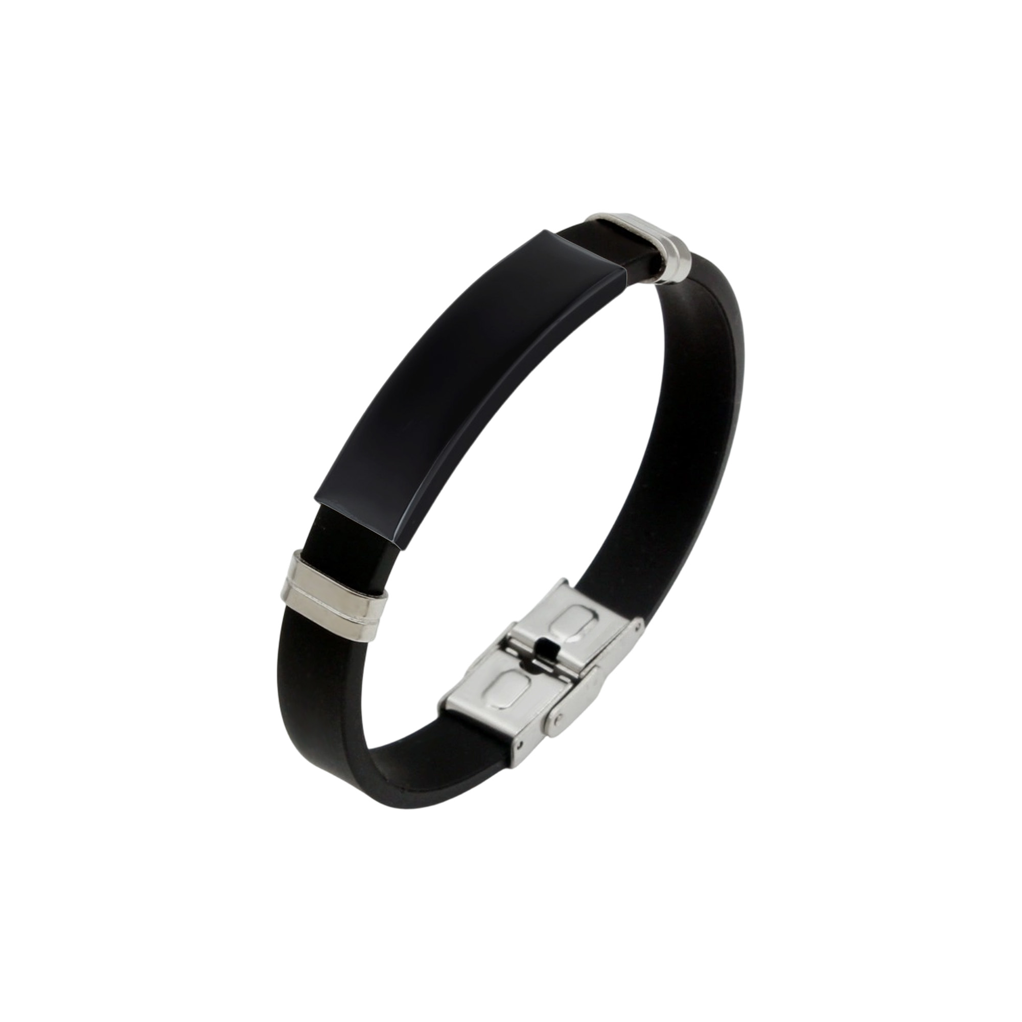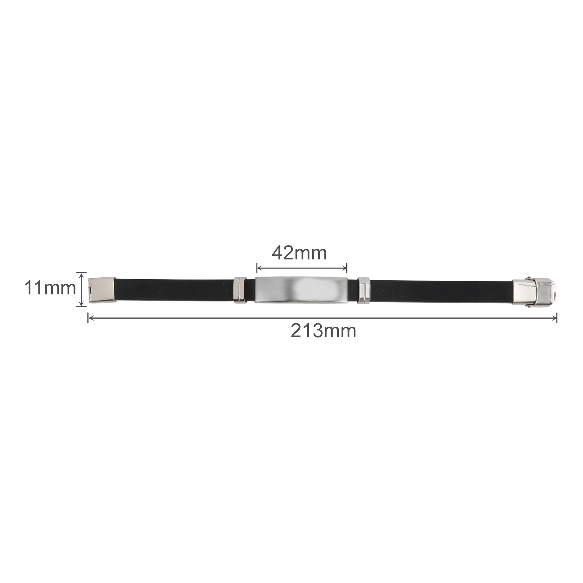 Get your branding seen with our Metal Buckle Latch Bracelet, featuring a classic hook buckle for reliable daily wear. Our bracelet combines a soft black silicone strap with a polished metal arc in silver, black or gold options. Crafted from durable silicone rubber and metal materials, our bracelet ensures lasting comfort and strength. Customise your logos or brand messages through engraving to ensure lasting brand visibility. Ideal for corporate gifting, team building events, or trade shows, our bracelet presents your brand in any environment. Sizing: Silicone bracelet: L213 x W11mm Metal: L42 x W11mm.