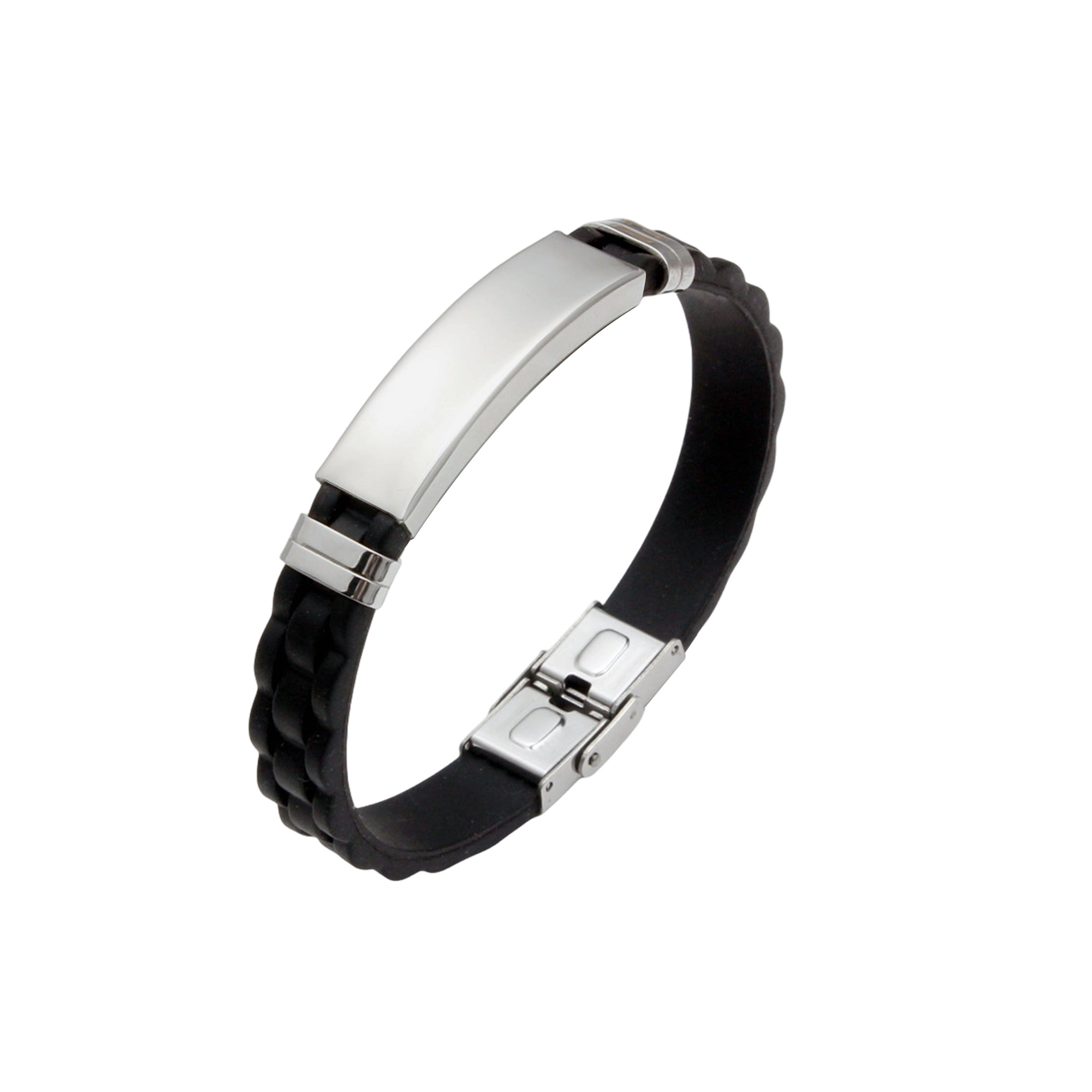 Promote your brand with our Stainless Steel Buckle Latch Bracelet, featuring a classic hook buckle and textured strap. Crafted from soft silicone rubber and polished metal materials, our bracelet offers lasting comfort and durability. The metal arc comes in silver, black or gold to suit various brands. Customised logos or brand messages through engraving on the arc can enhance the effect of brand promotions. Ideal for daily wear, sports events, or promotional activities, our bracelet provides comfortable wear and effective brand visibility. Sizing: Silicone bracelet: L213 x W11mm Metal: L42 x W11mm.