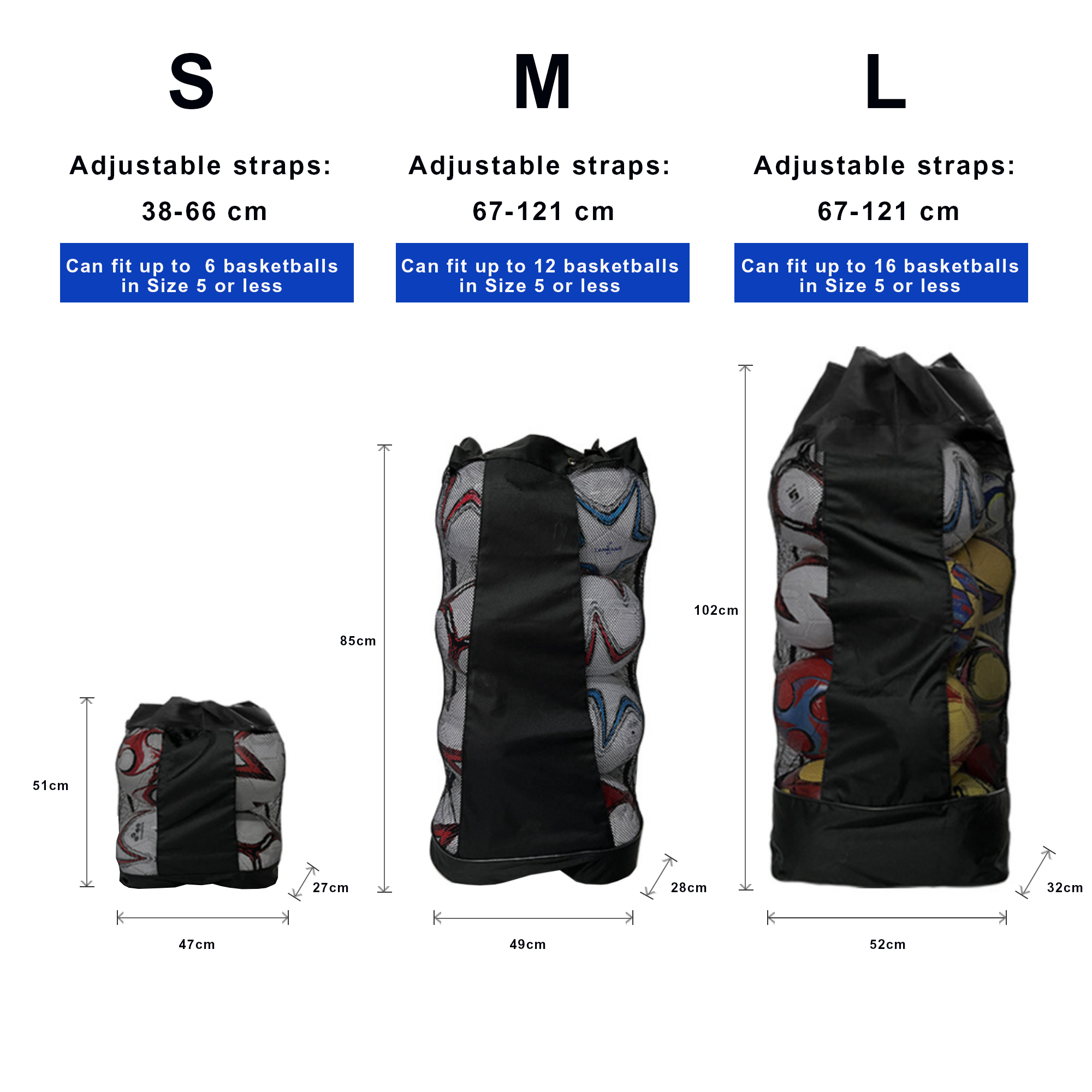 Our Drawstring Mesh Ball Bag is a wonderful ball sports companion in 3 sizes. Made of mesh and Oxford material, this drawstring bag is durable and can view contents inside, featuring a big drawstring mesh pocket which provides abundant space for your balls. With full colour heat transfer to highlight your design. Available in 2 colours. Sizing: Size S 47cm w 51cm h 27cm d Adjustable strap: 38-66cm (Can fit up to 6 basketballs in Size 5 or less Size M 49cm w 85cm h 28cm d Adjustable strap: 67-121cm (Can fit up to 12 basketballs in Size 5 or less Size L 52cm w 102cm h 32cm d Adjustable strap: 67-121cm (Can fit up to 16 basketballs in Size 5 or less.